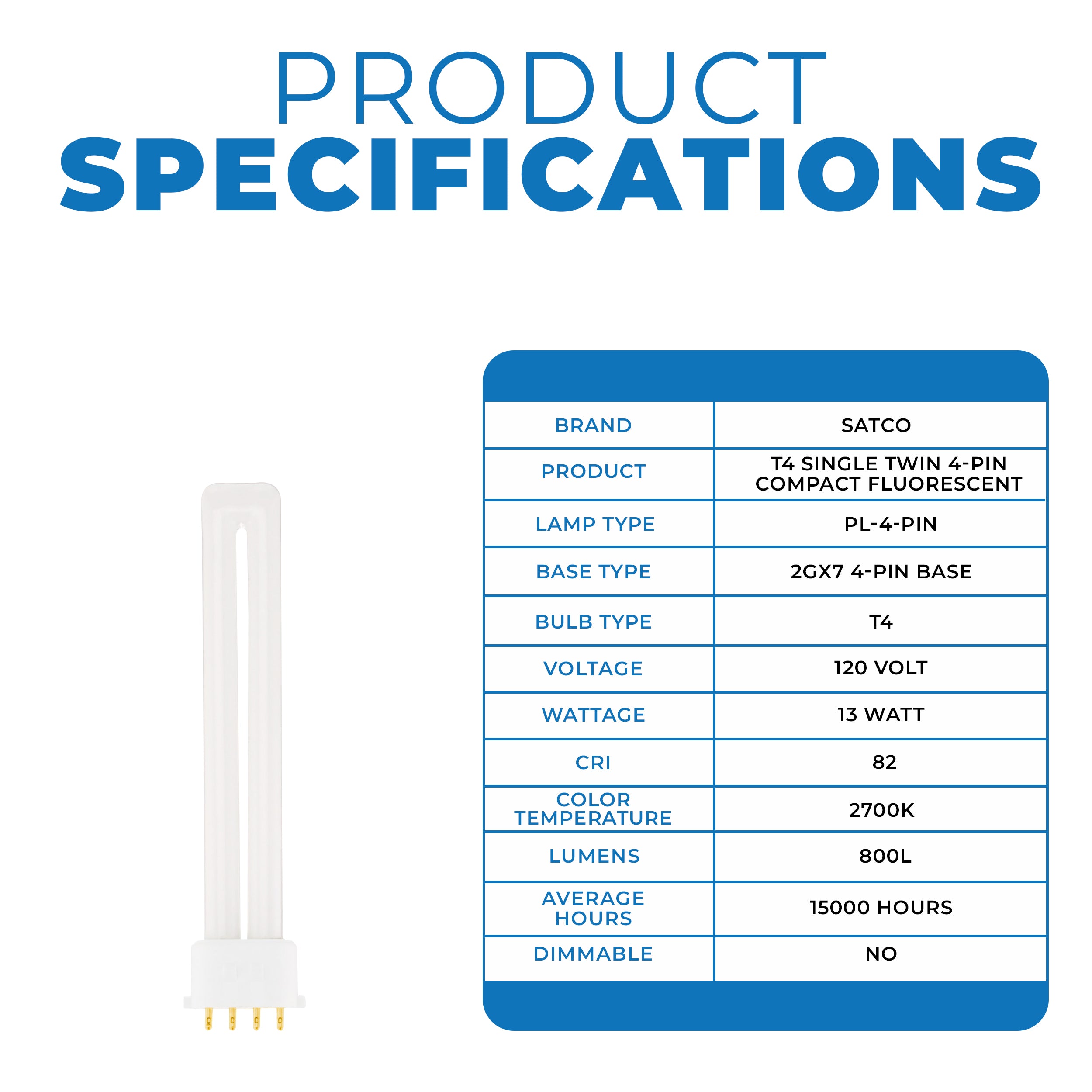 Satco S8366 13 Watt CFL T4 Single Twin 4 Pin, 2700 Kelvin, Warm White, 800 Lumens, 2G7 Pin-Base, 15000 Average Rated Hours