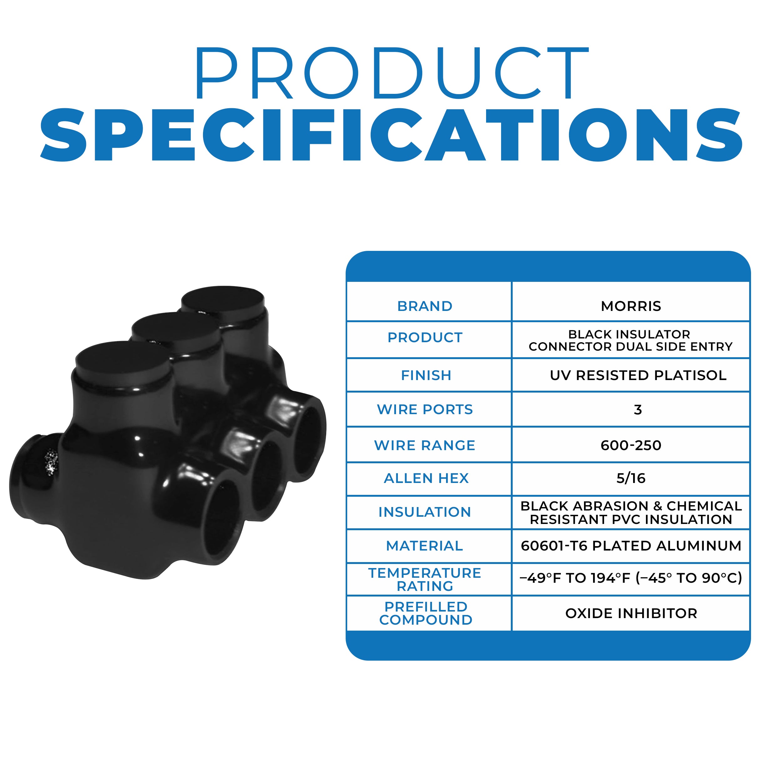 Morris Products 97663 Black Insulated Multi-Conductor Electrical Power Connectors 3 Ports 600 - 250 - Dual Side Entry - Our Dual Entry Cable Connector makes electric Splicing & Tapping Simple Fast & Easy