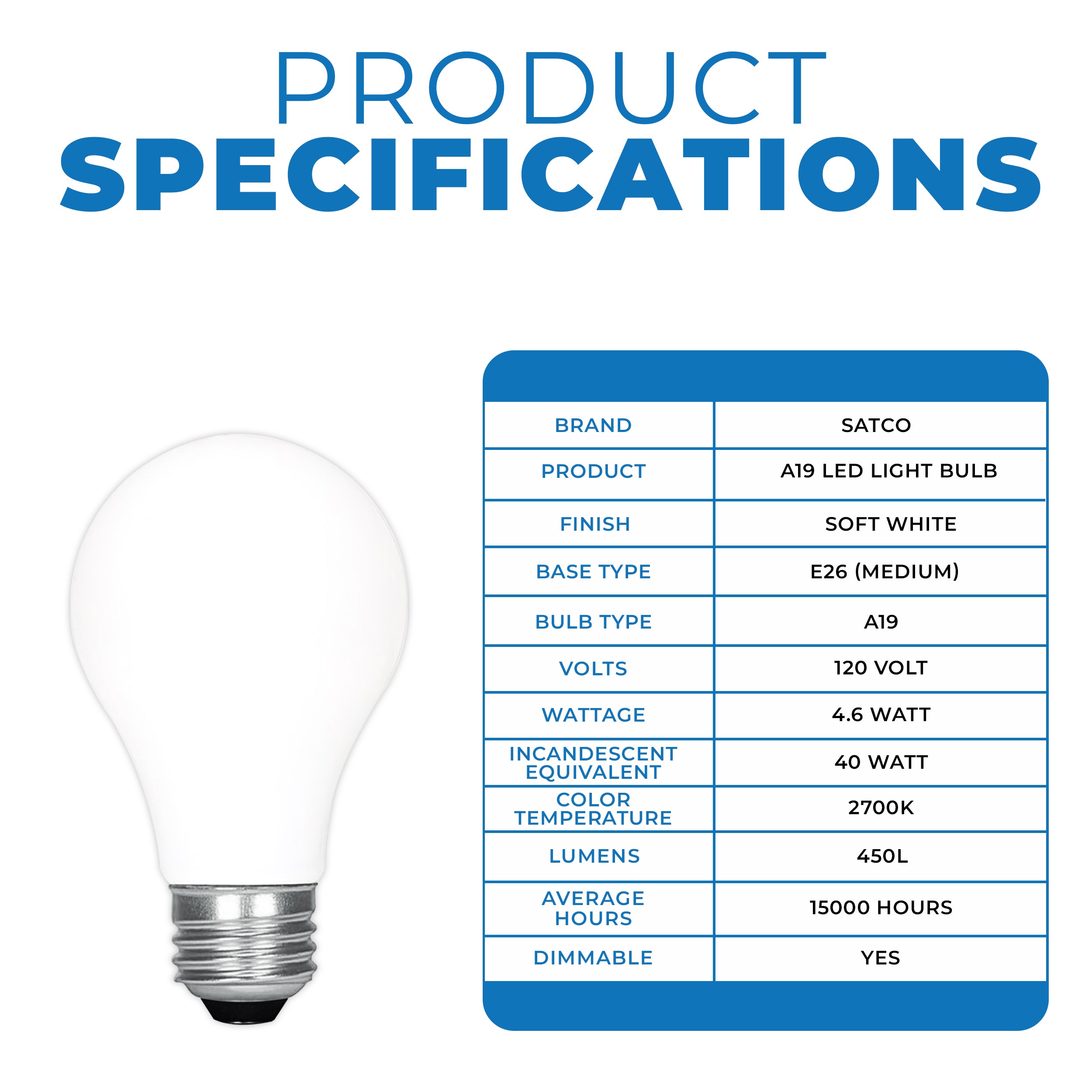 Satco S9824 4.5 Watt LED A19, 2700 Kelvin, Warm White, Frosted Finish, 450 Lumens, E26-Medium Base, 120 Volt, 40 Watt Incandescent Equivalent, Dimmable, 15000 Average Rated Hours