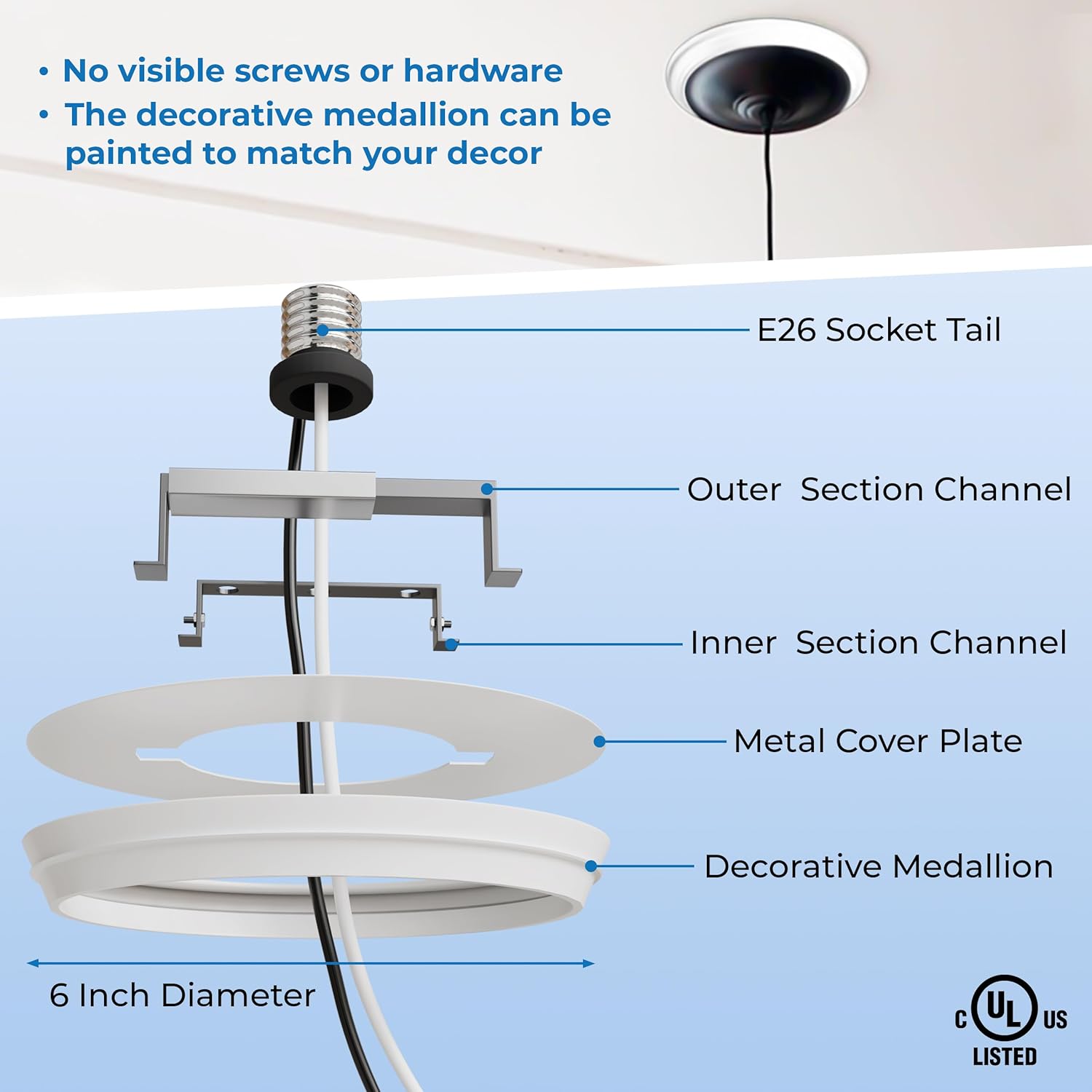 • ALL-INCLUSIVE KIT: Equipped with everything you need for flawless transformation. From adjustable bar, socket adapter, mounting bar, round metal plate, decorative medallion, and hardware. Hassle-free & stylish upgrade to your lighting