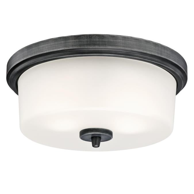 Brighten your space with the elegant and understated Courtfield two-light flush ceiling fixture. This fixture's drum shaped shade with frosted glass evenly diffuses light and will add sophistication to any space. Distressed aluminum finish adds warmth and casual style.