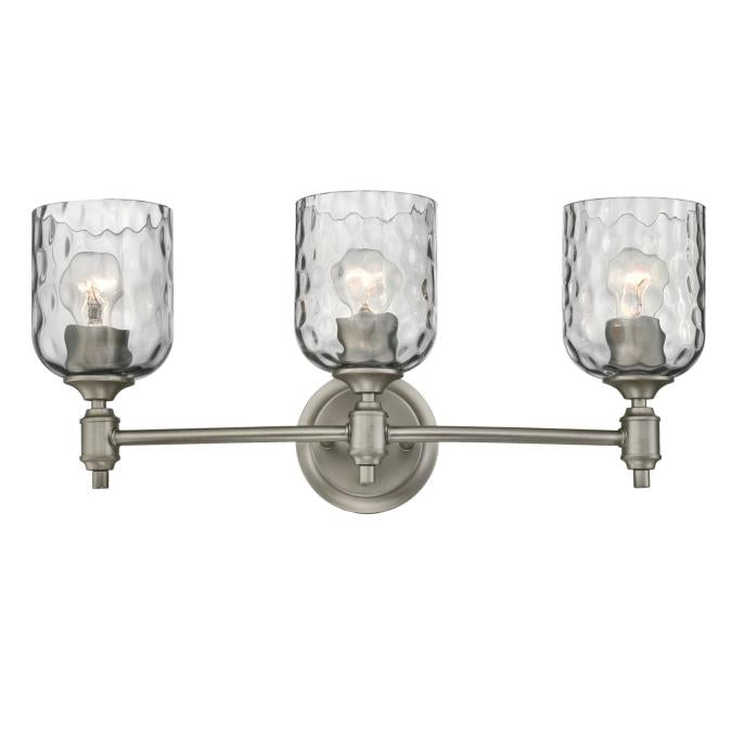 The transitional style of the three-light Basset wall fixture is a refreshing choice of lighting for a bathroom or powder room. Contemporary dark pewter finish is the perfect complement to brushed nickel vanity hardware and faucets. Smoke grey hammered glass allows a view of bare bulbs for a romantic aesthetic.