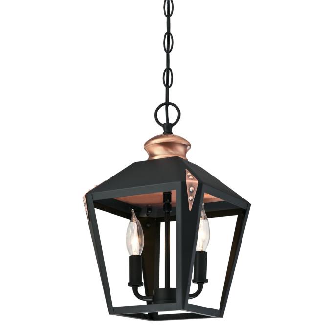 Bring classic charm to your indoor space with the refined historical style of the Valley Forge indoor two-light pendant. Copper accents on a matte black finish add a modern touch, while the feel of antiquity is sustained through the traditional lantern design. Perfect in farmhouse kitchens as well as traditional foyers.