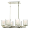 This stylish chandelier has distinctive urban flair and features a brushed nickel finish. Its linear, geometric design makes it attractive from all sides. Bold, beautiful block glass has a glazed ice finish diffusing light with sparkling effect.