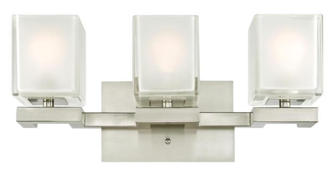 The brushed nickel Nyle three-light wall fixture features beautiful block glass with a glazed ice finish. Attractive geometric details are distinctive throughout the design for a bold, contemporary statement piece. Can be installed in an up or down position.