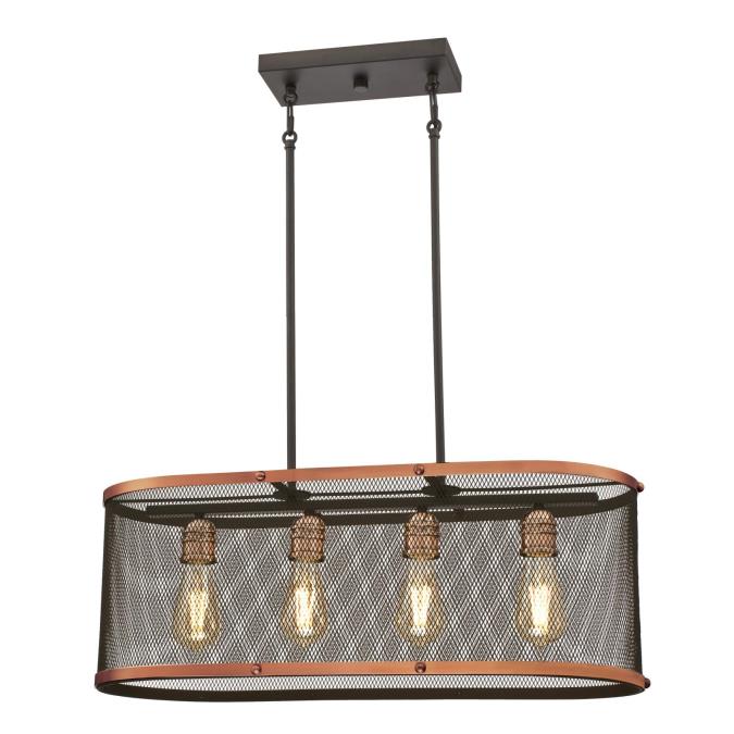The Emmett four-light chandelier features a mesh shade and a view of the bare bulbs, capturing a retro utilitarian aesthetic. An oil rubbed bronze finish is highlighted by washed copper trim, enhancing the vintage industrial appeal. Perfect for kitchens, dining rooms, foyers - anywhere you want to add personality and light.