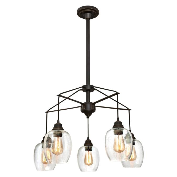 For a vintage look that is truly unique, featuring unrefined elements of design, the Eldon five-light chandelier is right for you. Braided cord and generously proportioned glass shades offer a refreshing spin on the vintage-style trend. Highlighted oil rubbed bronze finish lends hand-crafted appeal, while hand blown clear seeded glass complements the fixture's simplistic lines.