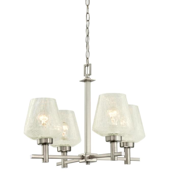 Create a sparkling atmosphere in your home with the Hennessey four-light chandelier. Understated brushed nickel finish adds a lustrous contemporary touch, while hand blown clear crackle glass glows brightly, reflecting exquisite patterns on surrounding surfaces. Add over a dining area for dancing light and tabletop illumination.