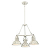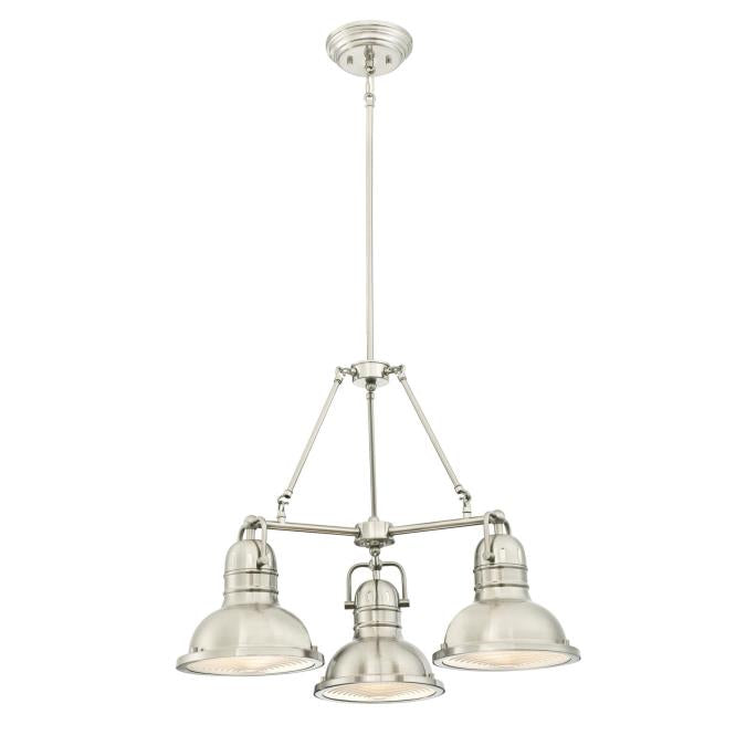 The versatile Boswell three-light chandelier will make a beautiful statement in any space. The vintage-style in brushed nickel finish will be the perfect complement, or the defining touch for industrial-styled rooms. The prismatic frosted acrylic lens reveals historical influences and bright illumination above a kitchen island or dining area.
