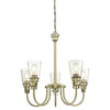 Combining simplistic style and industrial detailing, the Ashton five-light chandelier offers distinguishing character. The antique brass finish lends itself to traditional decor, as well as more up-to-date homes. The contemporary cone-shaped glass in clear seeded finish brings an element of sophistication to this versatile light fixture.
