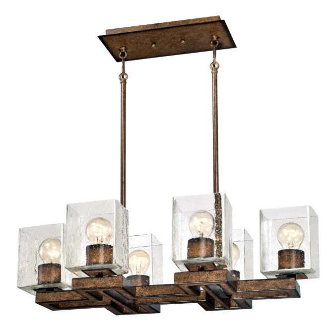 The Manchester chandelier features a distinctive finish and clear seeded glass shades, creating a rich, textural aesthetic. Hand-painted barnwood finish on metal adds a natural feel to the linear metal fixture design, and the strong shape of the glass is softened by the seeded pattern. Attractive from every angle, the Manchester chandelier is an example of refined, rustic elegance.
