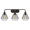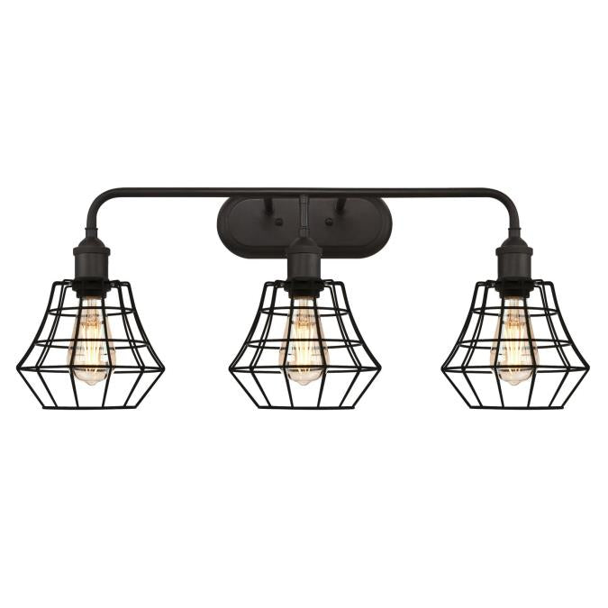 This Nathaniel three-light wall fixture is characterized by its distinctive industrial-style details, highlighted with an oil rubbed bronze finish. The angled bell cage shades, finished in matte black, add geometric interest to the design.