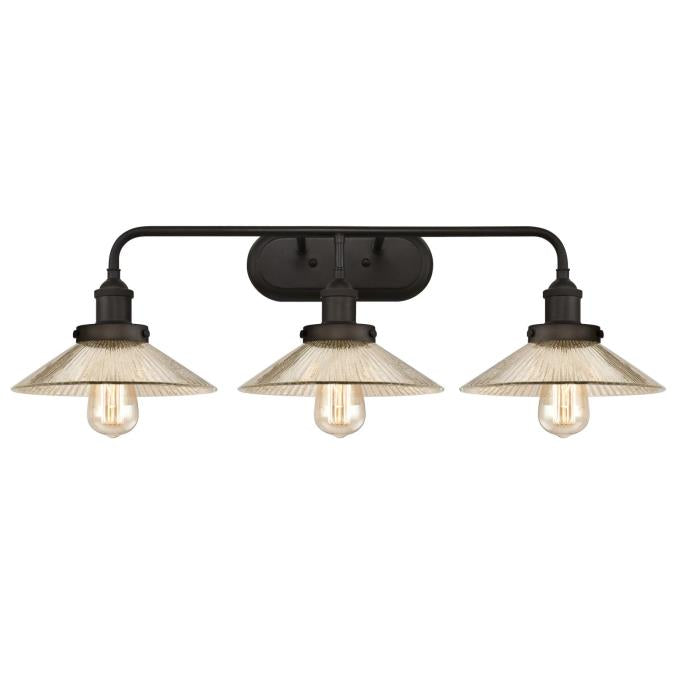 With its industrial-style details and antique mirror glass shades, this Bonnie three-light wall fixture adds distinctive lighting and character to any space. Enhancing the overall appeal of the design is a rustic oil rubbed bronze finish.