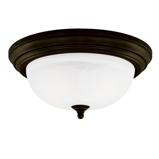 Capturing the essence of twentieth-century design, this one-light flush-mount interior ceiling fixture commands attention. The striking contrast between the oil rubbed bronze finish and frosted white alabaster glass creates a bold presence. A rounded finial adds to the elegant design of this fixture.