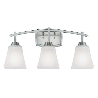 The Midori three-light brushed nickel vanity light fixture adds a lovely contemporary touch in a bathroom, powder room or bedroom. Designed with arts & crafts details in a lustrous brushed nickel finish, with frosted glass shades that create beautiful ambiance.