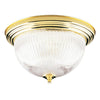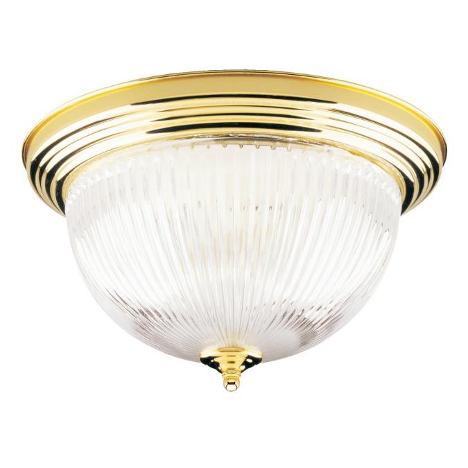 With a polished brass finish and crystal ribbed glass, this two-light flush-mount ceiling fixture adds brightness to your home. Lustrous and radiant, the fixture suits formal decors especially well.
