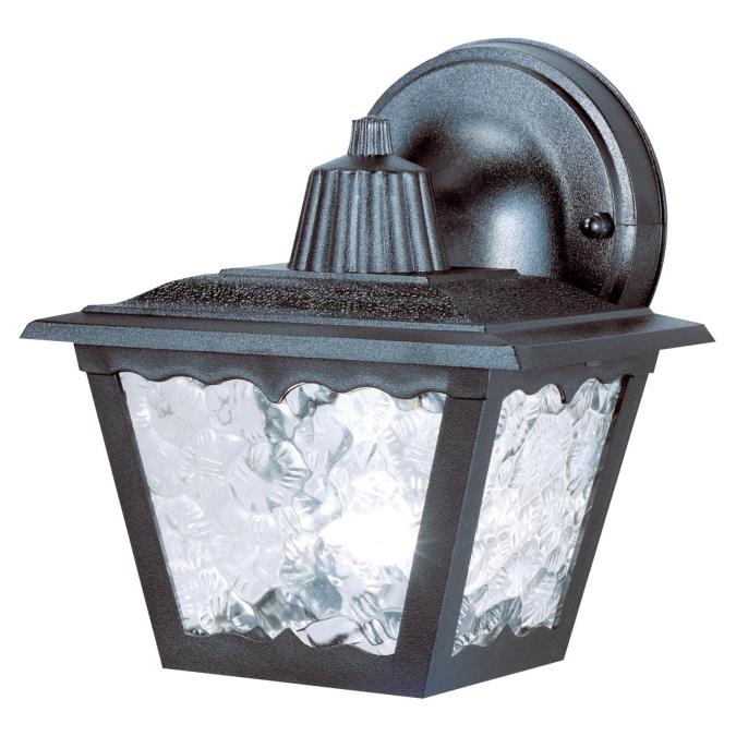 Delivering strength and versatility, this wall lantern adds a traditional touch to your exterior space. Hi-impact polypropylene construction ensures durability, while a black finish complements most home styles. Clear textured acrylic panels have a water glass quality that further enhances the classic aesthetic, and they are bordered on top by a stylized wave accent for added visual appeal. This light fixture also features a circular back plate and grooved finial.