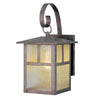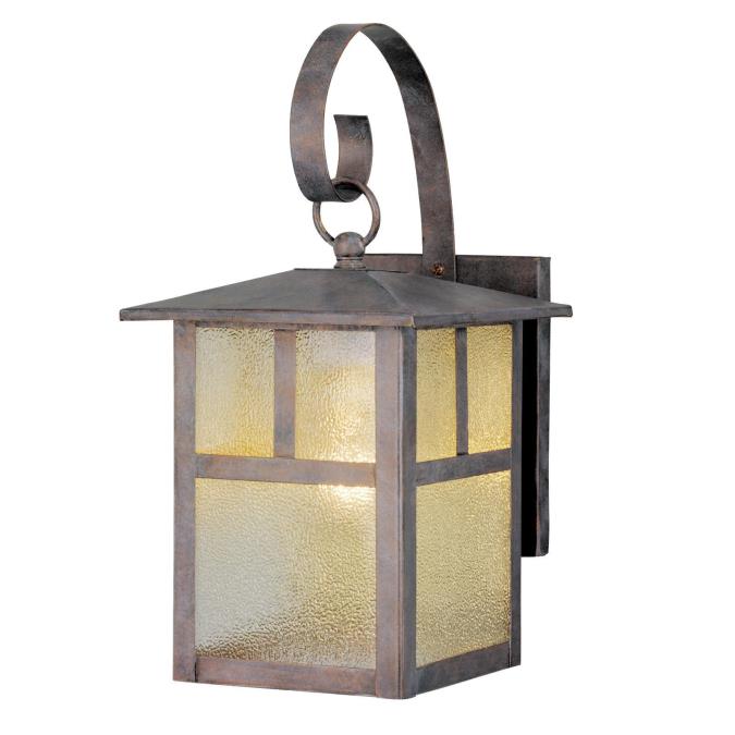 From the hands of the artisan to your front porch, this one-light wall lantern captures the beautiful simplicity of Arts and Crafts design. Clear textured glass panels and a decorative windowpane pattern provide warm, inviting light and rustic appeal. This lantern also features a bronze patina finish, scroll arm, loop finial, and rectangular back plate.