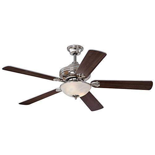 Defined by its handsome polished nickel finish, 5 reversible plywood weathered maple/beech blades, and white alabaster glass light fixture with decorative trim, this Westinghouse Anderson 52 in. indoor ceiling fan will add traditional style and comfort to any room. Ideal for rooms over 400 sq. ft. (20 x 20 ft.) with standard 8 ft. ceilings, this fan features a 153 mm x 17 mm silicon steel motor with triple capacitor for powerful, quiet air circulation. 3 fan speeds (high/medium/low) and a reversible switch help keep you comfortable all year. The ceiling fan provides airflow of up to 4,852 CFM. It is rated to operate at 58-Watt at high speed (without lights), which gives it an airflow efficiency rating of 84 CFM/Watt. (As a comparison, 49 in. to 60 in. ceiling fans have airflow efficiencies ranging from approximately 51 to 176 CFM/Watt at high speed). Anderson comes with everything you need for installation, including a 3/4 in. x 6 in. (D x L) downrod, a 54 in. lead wire, pull chains and 2 medium-base 13-Watt CFL light bulbs. It is backed by a lifetime warranty on the motor and a 2-year warranty on all other parts.