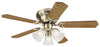 Add a distinctive traditional touch to any room with the Contempra Trio indoor ceiling fan. The antique brass finish and complementary oak or walnut blades bring aged character and charm to any decor style. The fan's hugger mount style provides year-round comfort in small to medium sized rooms with low ceilings. A cluster of three frosted glass shades emits bright, beautiful illumination.