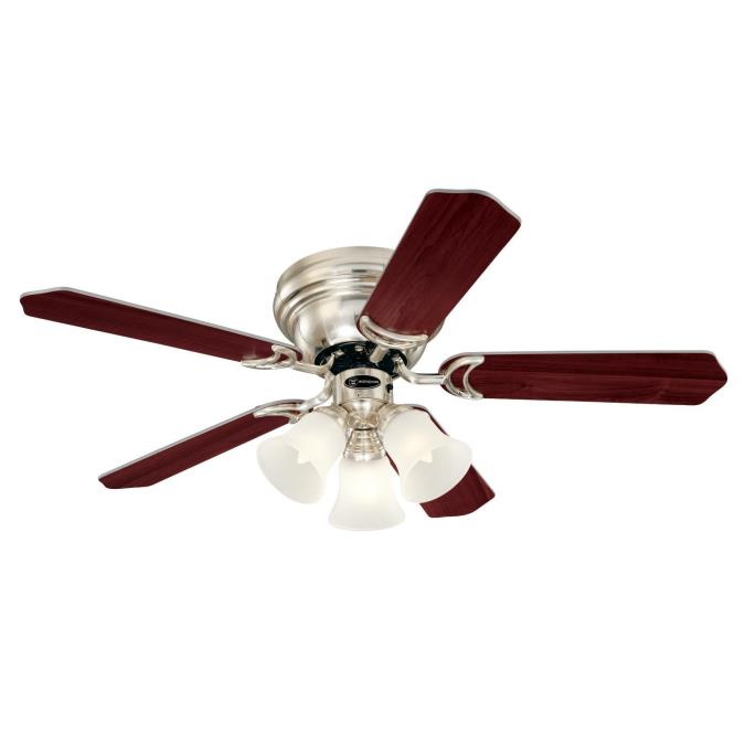 Add a distinctive traditional touch to any room with the Contempra Trio indoor ceiling fan in brushed nickel finish. Complementary rich rosewood or bird's eye maple blades provide a sophisticated look. The fan's hugger mount style provides year-round comfort in small to medium sized rooms with low ceilings. A cluster of three frosted glass shades emits bright, beautiful illumination.