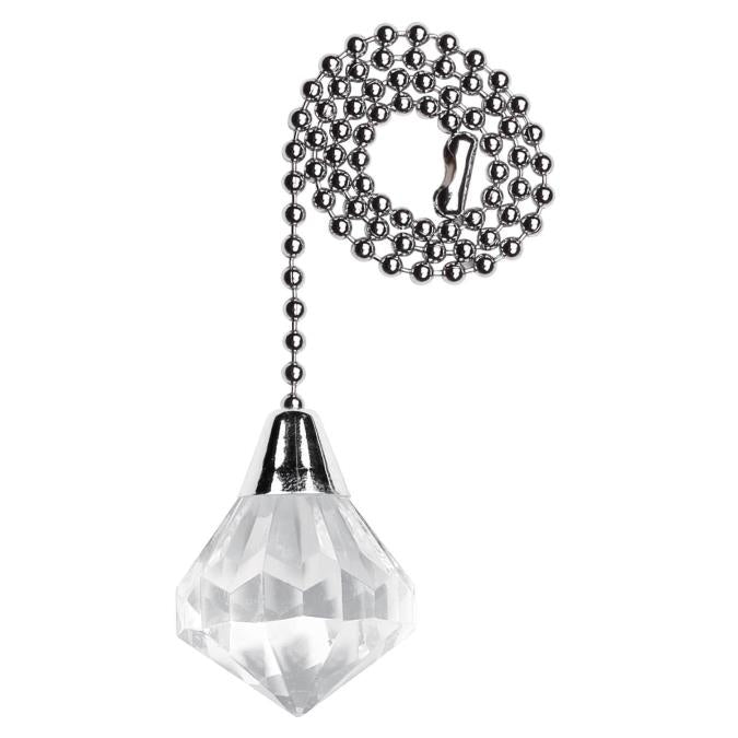 Indulge in a jeweled look with this acrylic diamond pull chain. It adds a luxurious touch to a fan or fixture while enabling manual light operation. The faceted acrylic diamond handle is fixed to the end of a 12-inch beaded chrome finish chain.