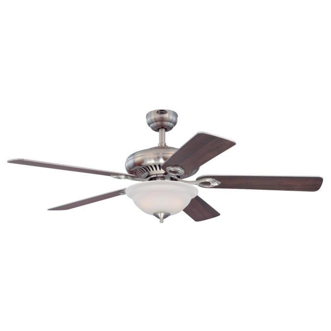 Add a traditional touch to your home with the distinctive Fairview ceiling fan. Designed with refined aesthetics, this ceiling fan features a brushed nickel finish and reversible weathered maple/dark cherry blades, giving it a balance of brightness and richness that will enhance the decor of any room. The versatile Fairview also includes a two-light frosted glass fixture that provides ample illumination and an attractive accent.