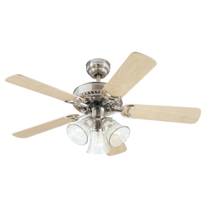 Add classic charm to your home's decor with the Newtown ceiling fan. With its lustrous brushed nickel finish, light maple/bird's eye maple reversible blades, and water glass shades, this fan is versatile enough to match any traditional decor.