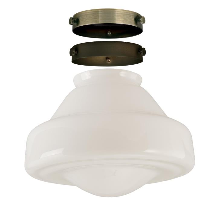 This classic design white opal schoolhouse shade kit brings a retro touch to any space. Featuring white opal handblown glass, the shade filters soft, even light. Included with this shade kit is your choice of an oil rubbed bronze or antique brass 2-1/4 inch fitter adapter that allows you to use this shade with any pendant fixture. Choose the finish that matches your pendant, use the socket ring included with the pendant to attach the adapter, screw in a light bulb and attach the glass shade using the decorative screws.