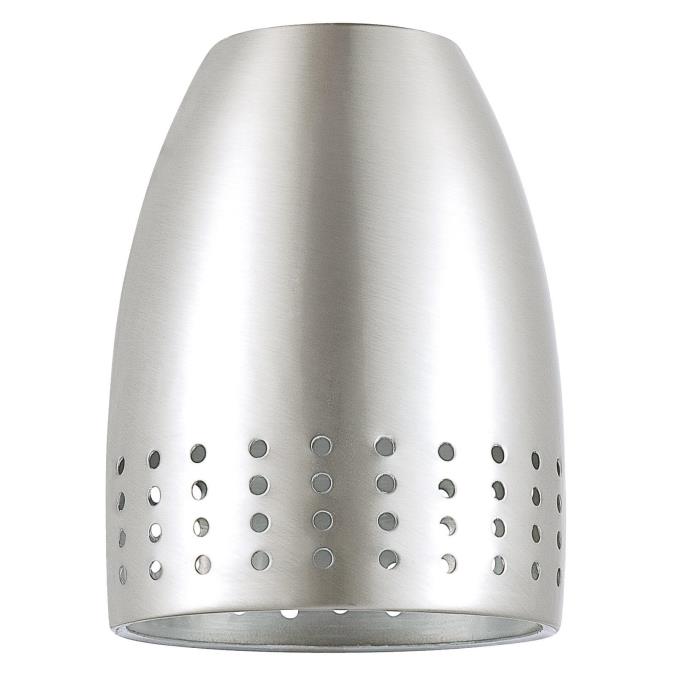This brushed nickel perforated metal neckless shade enhances any room with its contemporary design. The shade features a brushed nickel finish and four perforated rows on its lower half for greater light dispersal. A neckless design adds to the shade's sleek style and makes for easier installation.